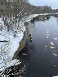 Mazliet pamaldījušies (gandrīz izkāpjam pie Vecsaikavas tilta), esam klāt vietā, kur iepriekšējo reizi finišējām. Pāris minūtēs esam nokrāmējušies, uztaisījuši piemiņas bildi pie upeszīmes “Aiviekste” un sākam slīdēt. Sākumā pat vārda tiešā nozīmē, jo kādi 5 metri pie krasta ir pabiezs ledus. Tālāk kabinām mūsu kanoe kopā un vienlaikus ar dažāda izmēra vižņiem un ledus gabaliem laižam lejā pa upi. Straume ir ideāla. Atkal vietām, kārtīgi pa visiem uzairējot, pārsniedzam 10 km/h. Tā vien liekas, ka līdz 25 km attālajai Ļaudonai, kur šodien beidzam laivošanu, nokļūsim ātrāk nekā domāts. Atrast vietu, lai izlocītu kājas un izkāptu krastā gan nav vienkārši. Ledus kārta upes malās ir sprīža biezumā. Neveiksmīgi pabakstījušies tur un šitur, beidzot “ostu” savām kanoe atrodam pie Kujas ietekas. Te joprojām ūdens ir kustībā, un līdz ar to krasti ir brīvi. Maza pīppauze, uztaisām pa fotogrāfijai, visi ieraujam pa 50 g, bet, lai nebūtu jādrebinās, kāpjam drīz vien atpakaļ laivās. Nav tiesa, ka laivot ziemā ir nepiemēroti, auksti, muļķīgi utt. Ja vien ūdens nav aizsalis vai arī pats nesēdi ūdenī, tas ir pavisam ok. Nekomfortabli ir tieši neairēt, un, kamēr rokas raiti cilās airi, būs patīkami un silti. Drēgnie brīži parasti sākas ar krastā kāpšanu. Pāris km pirms Ļaudonas mūs vēlreiz sazvana “Upmalu” kempings, lai pateiktu, ka ne pārāk lielu gabalu aiz viņiem upe ir apstājusies. Pirms Aiviekstes HES vižņi ir izveidojuši gandrīz km garu sastrēgumu. Nospriežam, ka pēc šodienas laivošanas būs kopā ar Jāni jāaizbrauc novērtēt situāciju pašiem.