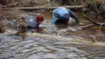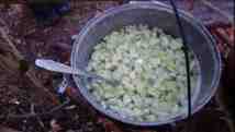 Dažreiz palīdz zāģis, cirvis vai lokanība. Citreiz Armands. Dodoties dziļāk, koku aizbirumi kļūst arvien masīvāki. Pirmajā dienā esam spējīgi nobraukt ne vairāk kā 4 km. Laicīgi meklējam telšu vietas, jo šis brauciens ir īpašs (līdzīgi kā citi “Ielūdz Guntis Grūbe” laivu pasākumi). Bez telšu vietu un ugunskura iekārtošanas ir jāatrod laiks kārtīgu vakariņu pagatavošanai. Šoreiz tradicionālo ugunskurzupu aizstāj upes krastā gatavots liellopa gaļas gulašs, kas papildināts ar baravikām, saldo krējumu, kartupeļiem, svaigām salātlapām un redīsiem. Desertā vārām solīto rabarbera ķīseli, kuru pārlejam ar pienu. Punktu uz „i” uzliek Dāvis ar līdzpaņemto ģitāru.